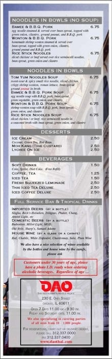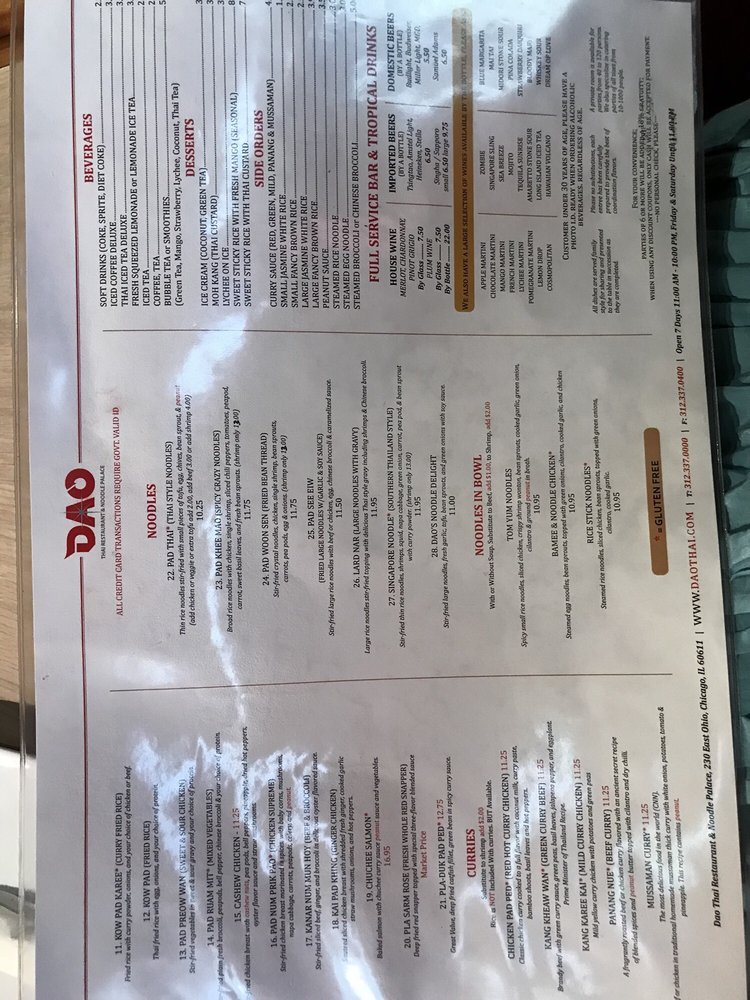 Dao Thai, located at 230 E Ohio St in Chicago, is a popular Thai restaurant that offers a variety of options for diners. With features like taking reservations, offering delivery and takeout, and providing vegan and vegetarian options, Dao Thai caters to a diverse range of customers. The restaurant also has outdoor seating, a full bar, and free Wi-Fi, making it a great choice for gatherings with friends or family. The menu features traditional Thai dishes prepared with authentic flavors and fresh ingredients. From spicy curries to flavorful noodle dishes, Dao Thai has something for everyone. The casual atmosphere and attentive waiter service enhance the dining experience, making it a must-visit spot for Thai food enthusiasts in the area.